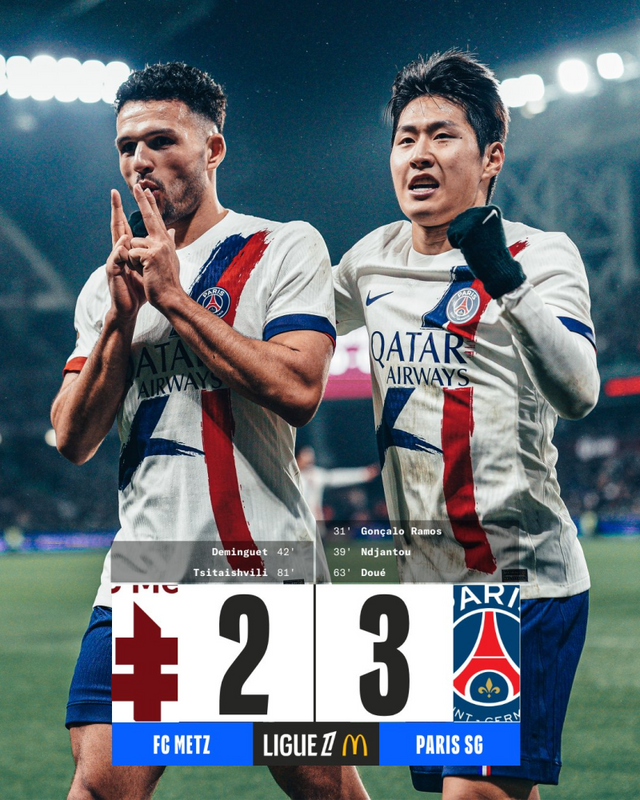 기세를 탄 PSG는 은장투의 추가 골로 달아났다. 메스는 전반 42분 제시 데밍게의 슈팅으로 1골 만회했다.