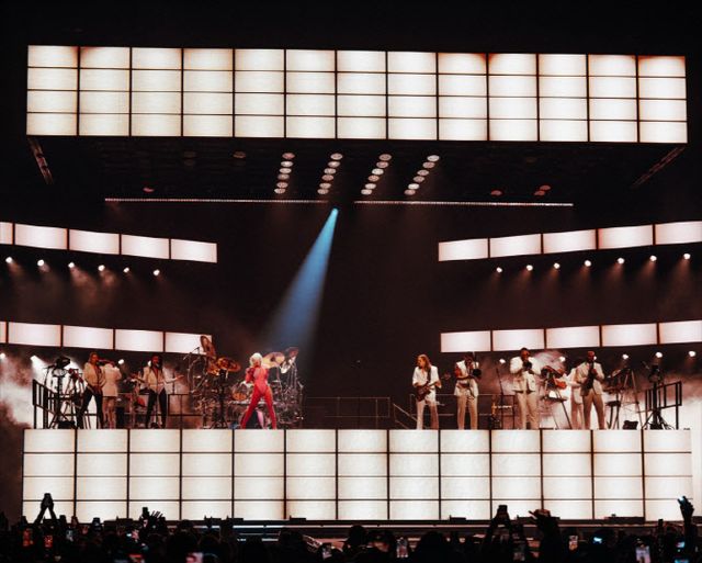 도자 캣은 이날 엉덩이 라인이 훤히 드러나는 검은색 보디수트 스타일 의상을 입고 테트리스를 연상시키는 사각형 레이어 구조의 무대에 모습을 드러냈다. ‘카즈’(Cards)로 공연 포문을 연 그는 브라스를 중심으로 한 1980년대풍 라이브 밴드의 연주에 맞춰 노래하고 춤추며 무대 곳곳을 누볐다.