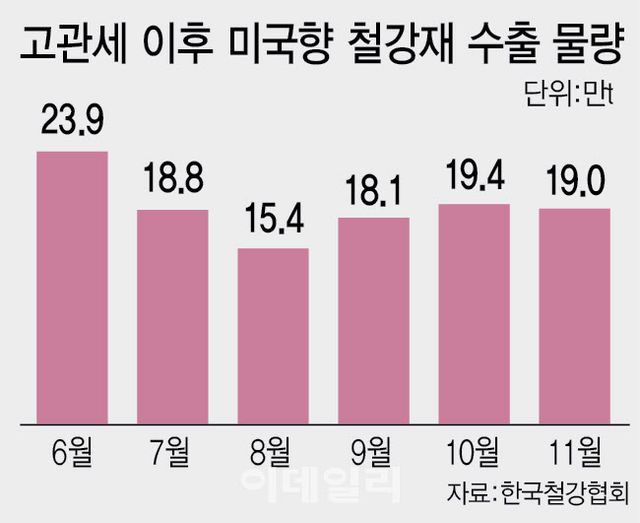철강 수출 물량이 급감한 것은 한국 철강의 최대 수출국인 미국의 고관세 조치에 따른 여파다. 실제로 대미 철강 수출량은 트럼프 2기 행정부가 철강·알루미늄 관세 25%를 발효한 올해 3월 이후 6월까지 20만t대를 유지해 왔다. 하지만 6월 관세가 50%로 인상된 이후 7월 18만8172t으로 전달에 비해 5만t이나 뚝 떨어진 이후 △8월 15만4164t △9월 18만1477t △10월 19만3926t △11월 18만9788t으로 5개월 연속 20만t을 하회했다.