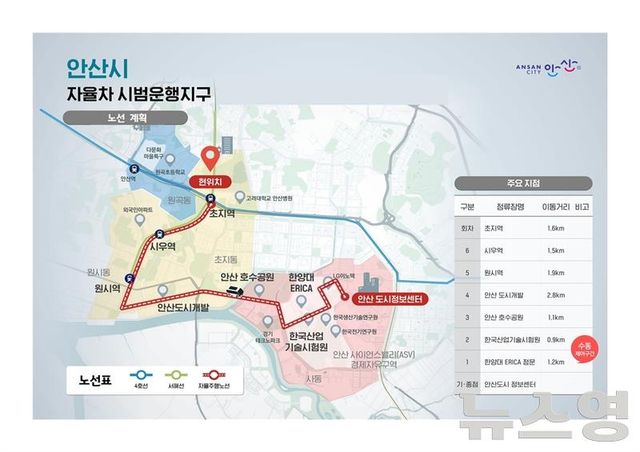자율주행차는 상록구 사동의 안산시 도시정보센터를 기점으로 한양대ERICA 캠퍼스 정문-한국산업기술시험원-안산호수공원-안산도시개발-원시역-시우역-초지역에 이르기까지 약 11㎞ 구간을 운행할 예정이다.