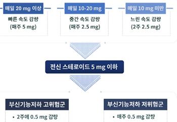 기저 프레드니솔론 용량에 따라 하루 20mg 이상 복용하는 경우에는 주당 5mg의 빠른 속도로 감량하고, 10-20mg에서는 주당 2.5mg의 중간 속도로 감량한다. 10mg 미만에서는 2주 간격 2.5mg의 느린 속도로 감량하며, 하루 5mg까지 도달하면 부신기능저하의 위험도를 평가해 감량속도를 조절할 수 있다.