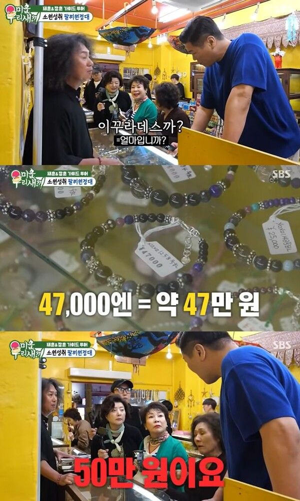 허경환의 모친은 가방에서 꺼낸 종이를 펼쳐 들고는 상점 직원에게 "이꾸라데스까(얼마입니까)"라고 물었다. 그가 고른 팔찌의 가격은 4만7000엔이었다.