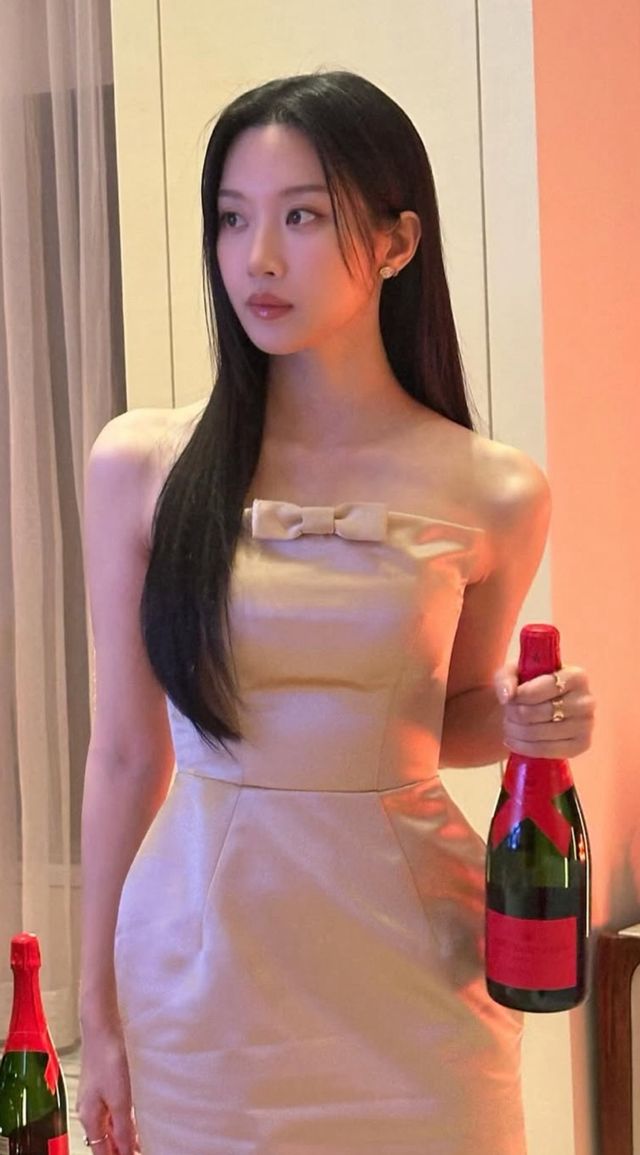 공개된 사진 속 문가영은 실내 공간에서 샴페인 병을 손에 든 채 포즈를 취하고 있다.