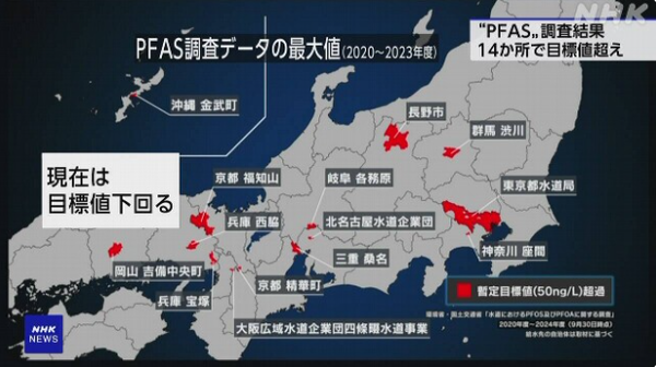한편, 2024년 12월 1일 방송된 NHK 스페셜 「조사보도 신세기 File8 추적 ‘PFAS 오염’」에 등장한 ‘수도수 PFAS 전국 맵’에서는 타마시(多摩市)가 국가 잠정 목표치 50나노그램을 초과했다는 의미의 ‘빨간색’으로 표시돼 시 주민들의 불안을 자극했다. 그러나 타마시는 공식 설명에서, 도쿄도 수도국이 23구와 일부를 제외한 다마 지역 전역에 급수를 하는 구조상, 한 수도 사업자가 여러 지자체에 물을 공급하는 경우 그 공급 구역 안에서 나온 측정값의 ‘최대값’을 모든 지자체에 일괄 반영하는 방식이라고 밝히고 있다. 그 결과 지도로만 보면 모든 지자체가 기준을 넘은 것처럼 보이지만, 타마시가 실시해 온 자치단체별 수질 검사에서는 지금까지 한 번도 국가의 수질관리 잠정 목표치 50나노그램을 넘지 않았다고 강조한다.