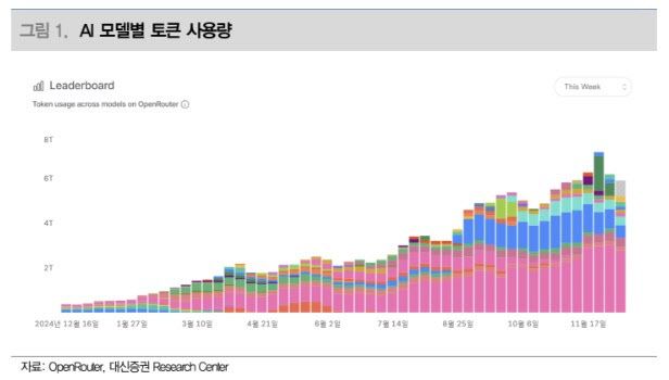 아울러 “오픈라우터가 발표하는 AI 모델별 토큰 사용량은 올해 1분기부터 4분기까지 꾸준히 상승하고 있다. 특히 올해는 기업의 AI 모델 사용이 수요를 견인하고 있다”며 “에이전트 AI 사용이 이제 막 시작된 점을 고려하면 AI 수요에 대해 우려할 시점은 아니다”라고 강조했다.