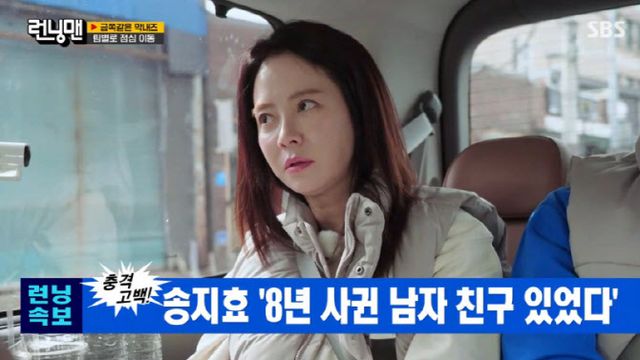 송지효는 “(헤어진지) 4~5년 됐다. 오래 만났다. 8년 사귀었다”고 고백해 모두를 놀라게 했다. 이에 지석진은 “우리가 아는 그 사람인가” 물었고, 송지효는 “그 사람 아니다”라고 답했다.