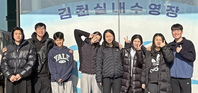 중문중 수영부. 왼쪽부터 조성우 이명훈(중문중 체육부장) 임준서 조유진 나원영 박민서 허태연 문정민(지도자).