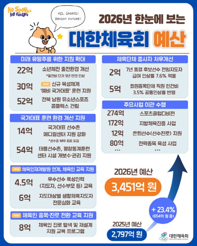대한체육회는 15일 “2026년 예산이 올해(2797억 원)보다 654억원 증가했다”며 “문화체육관광부 및 유관기관에서 630억 원 규모의 사업이 대한체육회로 이관되고, 체육인 지원을 위한 필요 예산이 반영되면서 전체 예산 규모가 확대됐다”고 밝혔다.