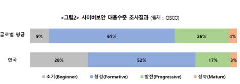 이같은 상황에서 국내 기업들의 보안 수준은 글로벌 평균 수준보다 낮은 것으로 나타났다. 네트워킹 및 사이버보안 솔루션 기업인 시스코(CISCO)가 올해 1월 미국, 일본, 영국, 호주, 대만 등 30개국의 기업인 8000명을 대상으로 사이버보안 준비 수준을 조사한 바에 따르면, 30개국 평균 보안 수준이 ‘발전·성숙’ 단계 30%, ‘초기·형성’ 단계 70%로 집계된 반면, 우리나라는 ‘발전·성숙’ 단계 20%, ‘초기·형성’ 단계 80%로 낮게 나왔다.