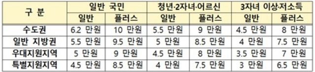 비수도권 거주자에 대한 혜택은 더욱 강화되었다. 비수도권 일반인은 월 5만 5000원, 청년·노인·2자녀 가구는 5만 원, 3자녀·저소득층은 4만 원이 기준금액이다. 특히 인구감소지역으로 지정된 곳의 주민들은 '우대지원지역' 및 '특별지원지역'으로 분류되어, 위 기준금액에서 각각 5000원, 1만 원씩 더 낮아진 금액을 적용받는다.