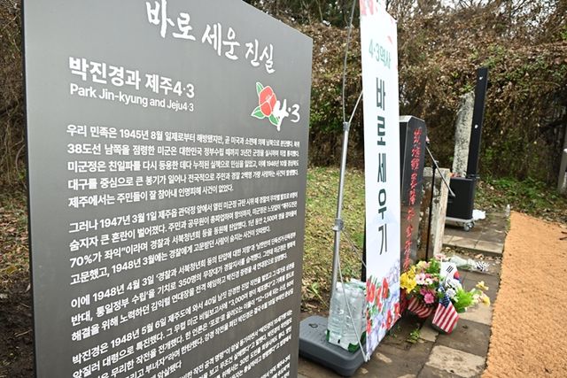 제주특별자치도와 제주4·3평화재단, 제주4·3희생자유족회는 15일 제주시 어승생 한울누리공원 인근 도로변에 설치된 박진경 추도비 바로 옆에 이런 내용을 담은 '바로 세운 진실' 안내판을 설치했다.