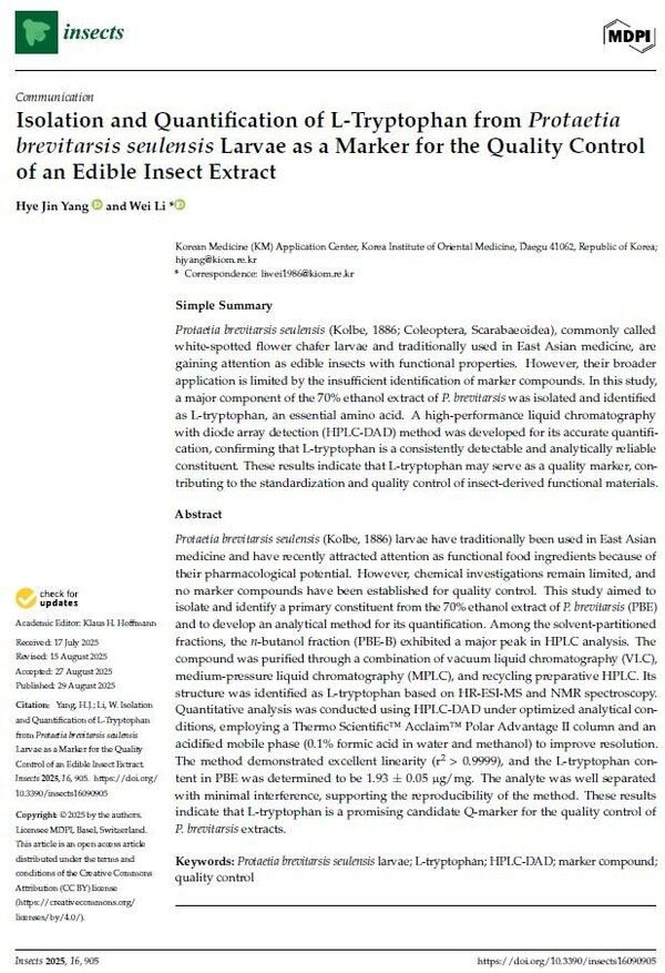 이번 연구 결과는 국제학술지 'Insects'(IF 2.9)에 게재됐고, 분획물과 관련해 한국한의학연구원과 공동으로 특허도 출원해 산업적 활용 가능성을 확보했다.
