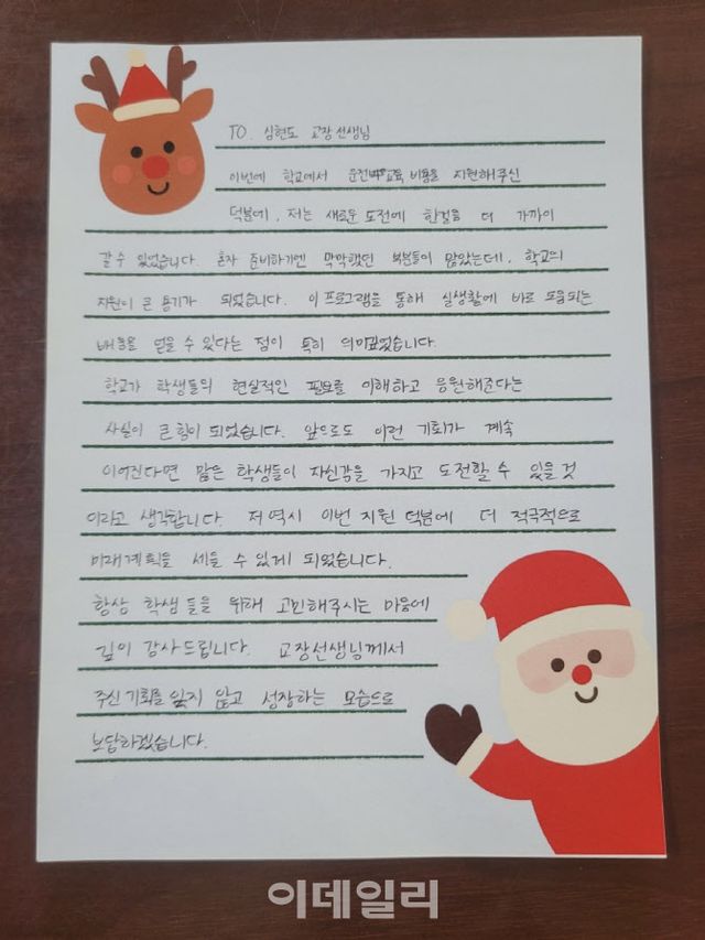 심현도 부천정보산업고 교장 앞으로 고3 학생들이 보낸 손 편지 내용의 일부다. 부천정보산업고 교장실은 일명 ‘과자실’로 불린다. 심 교장 부임 후 학생들이 편하게 와서 쉬다 갈 수 있는 사랑방이 됐다. 하나둘 운전면허를 따기 시작한 학생들은 어김없이 교장선생님을 찾아와 자랑하기 바쁘다.