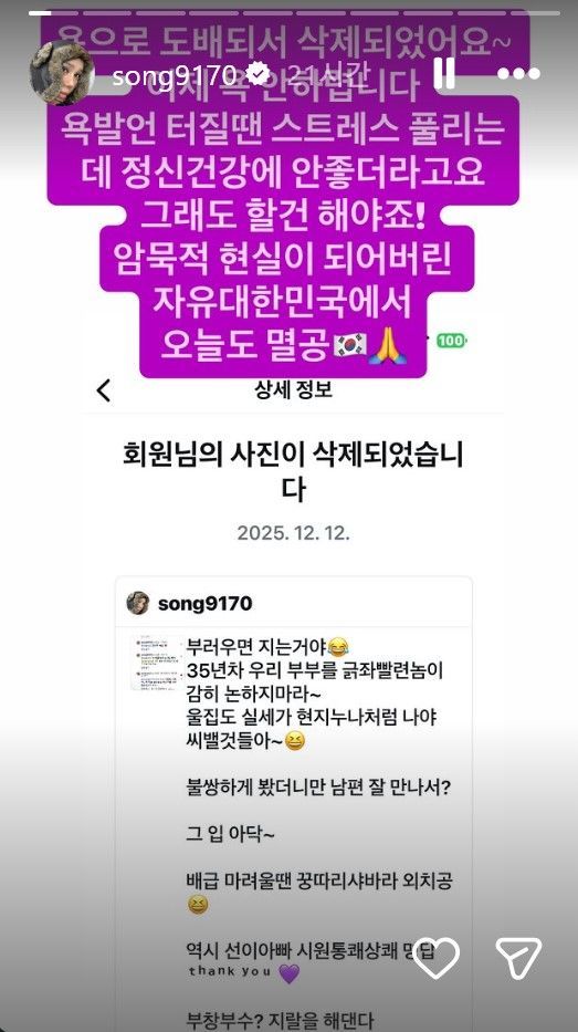 댓글에는 "부러우면 지는거야. 35년차 우리 부부를 좌빨XX이 감히 논하지 마라" "불쌍하게 봤더니만 남편 잘 만나서? 그 입 아닥" "배급 마려울 땐 꿍따리샤바라 외치고" "부창부수 지X을 해댄다" 등 특정 표현을 두고 거친 반응을 보이며 비속어가 포함된 문장이 이어졌다.