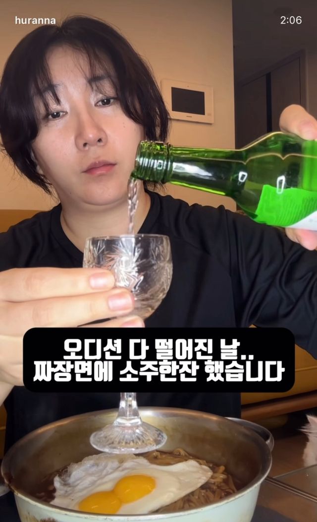 허안나는 15일 자신의 SNS에 “오디션 다 떨어지고 집에서 짜장면에 소주 한잔하기”라는 글과 함께 영상을 올렸다.