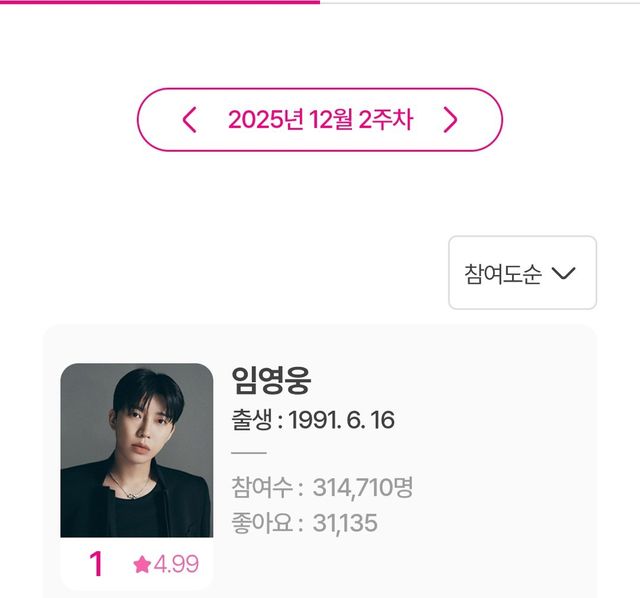 이 랭킹은 단순 투표가 아니라 팬들의 참여 강도를 수치로 보여주는 지표다. 임영웅은 평점랭킹뿐 아니라 ‘좋아요’ 항목에서도 가장 많은 3만1135개를 받았다. 주간 집계마다 비슷한 결과가 반복되고 있다는 점에서 팬덤의 지속성이 그대로 드러난다.