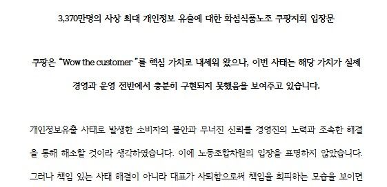 쿠니언은 15일 공식발표한 입장문을 통해 "쿠팡이 개인정보유출 사태로 발생한 소비자의 불안과 무너진 신뢰를 경영진의 노력과 조속한 해결을 통해 해소할 것이라고 생각했었다"면서 "그러나 대표가 사퇴하고 책임 회피 하는 모습을 보이며 상태가 장기화되고 기업 위기가 직원들에게도 번지도 있다"고 밝혔다.
