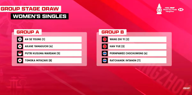 앞서 13일 항저우에 있는 인터콘티넨탈호텔에서 진행된 월드투어 파이널 조 추첨식 결과, 안세영은 A조에서 야마구치 아카네, 미야자키 도모카(이상 일본), 푸트리 쿠수마 와르다니(인도네시아)와 한 조가 됐다.