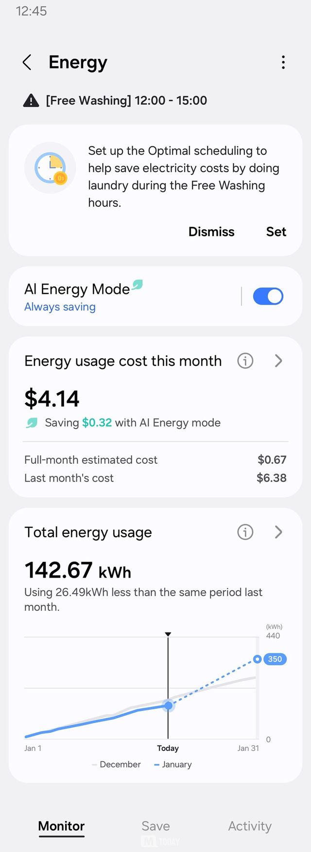 사용자들은 스마트싱스 앱의 '에너지' 기능을 통해 더욱 편리하게 전기요금 할인 혜택을 누릴 수 있다. 스마트싱스 에너지에서 전기요금 혜택이 제공되는 시간에 맞춰 알림을 제공받을 수 있고 연결된 집안 가전들의 사용량과 전기요금을 한눈에 모니터링할 수 있다.