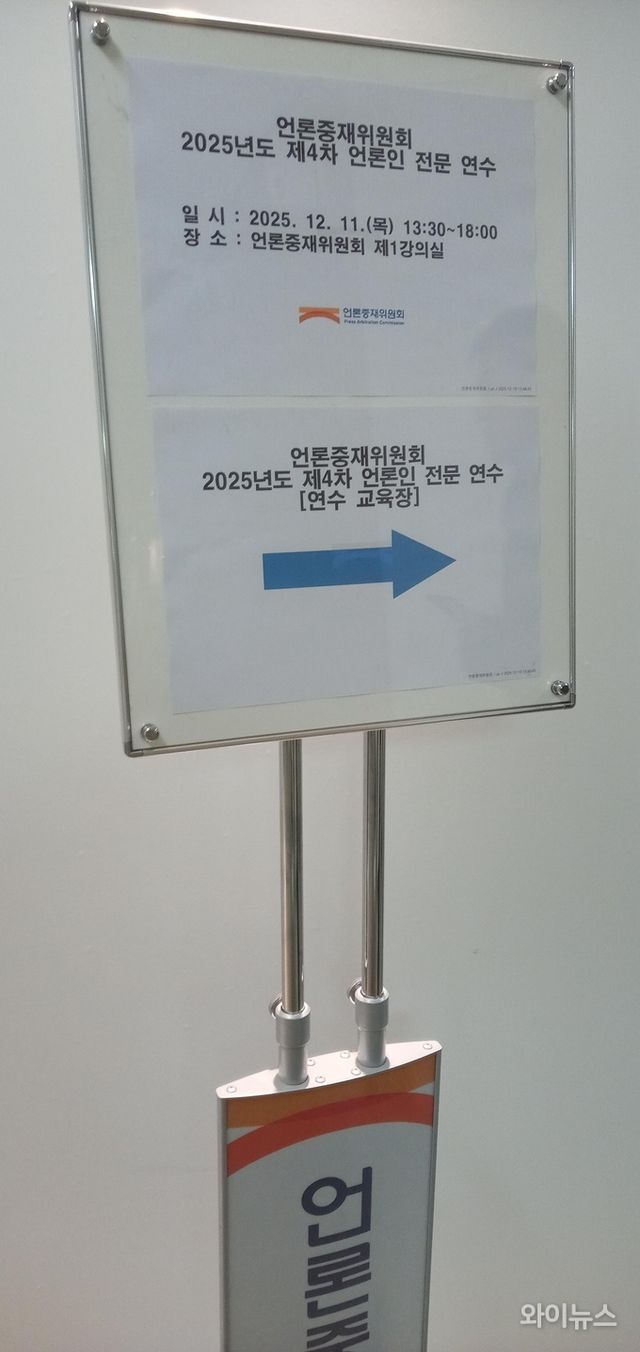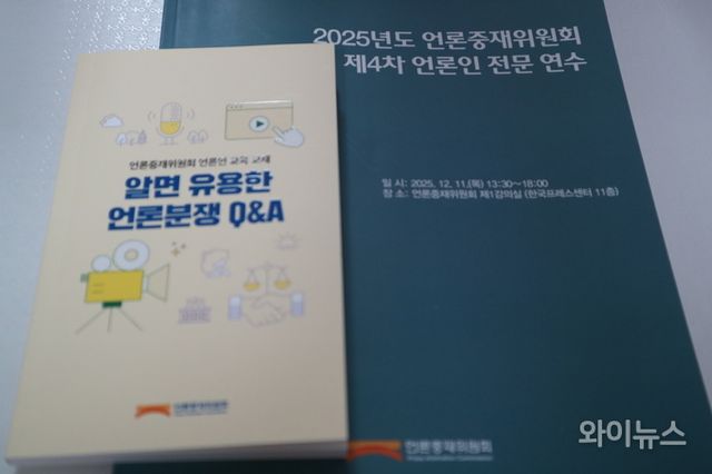 [와이뉴스] 2025년도 언론중재위원회 제4차 언론인 전문 연수가 앞선 11일 오후 한국프레스센터 언론중재위원회 제1강의실에서 열렸다. 연수는 제1강 △언론인이 꼭 알아야 할 저작권 가이드, 제2강 △기자라면 꼭 알아야 할 시정권고제도, 제3강 △사례를 통해 알아보는 언론피해 구제제도 등 총 3강으로 구성됐으며 각 김지수 변호사, 구율화(변호사) 언중위 시정권고심의팀장, 김승아 교육팀장이 강의를 맡았다. 연수에는 수십여 언론인이 참석해 진중하게 강의를 경청하고 열띤 질의 응답을 이었다.