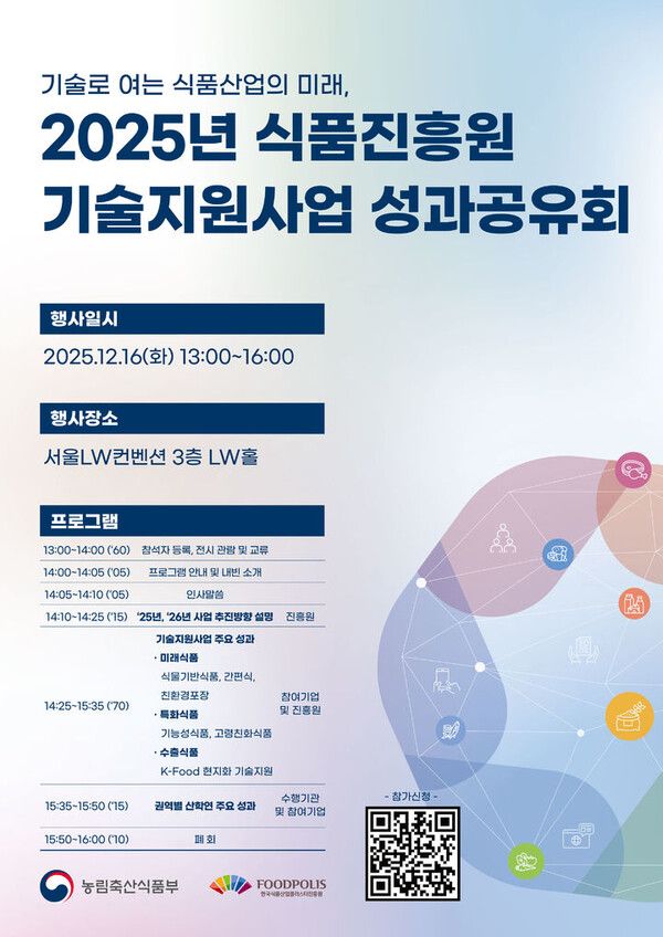 뉴시스 보도에 따르면, 한국식품산업클러스터진흥원은 16일 서울 중구 LW컨벤션센터에서 '2025년 기술지원사업 성과공유회' 행사를 개최했다고 밝혔다.