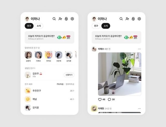 ‘소식’ 옵션을 선택하면 피드(게시물) 형태로 제공되는 친구들의 다양한 소식을 볼 수 있다. 카카오는 이용자 성향과 사용 목적에 따라 친구 관리와 콘텐츠 탐색을 보다 직관적으로 할 수 있도록 사용자 환경(UI)을 개선했다고 설명했다.