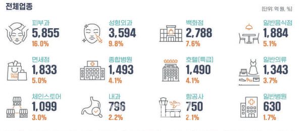 외국인 환자의 카드 이용이 가장 많은 업종은 피부과(5855억원)가 차지했다. 전체 집계 금액의 약 16.0%로 이용 비중이 가장 높다. 그 뒤를 이어 △성형외과(3594억원, 9.8%) △백화점(2788억원, 7.6%) △일반음식점(1884억원, 5.1%) △면세점(1833억원, 5.0%) 순이었다.