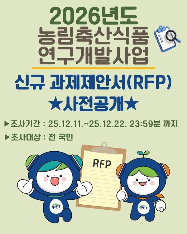 뉴시스 보도에 따르면, 농림식품기술기획평가원은 내년도 농림축산식품 연구개발(R&D) 사업 신규과제 발굴을 위해 과제제안서(RFP) 사전 공개를 실시하고, 2027년 신규 연구개발사업 기획을 위한 기술수요조사 기간을 연장한다고 16일 밝혔다.