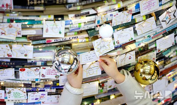 [서울=뉴시스] 16일 경북 경산시 대구대학교 경산캠퍼스 창파도서관에서 학생들이 북(Book) 트리에 새해 소원을 담은 소원지를 매달고 있다.