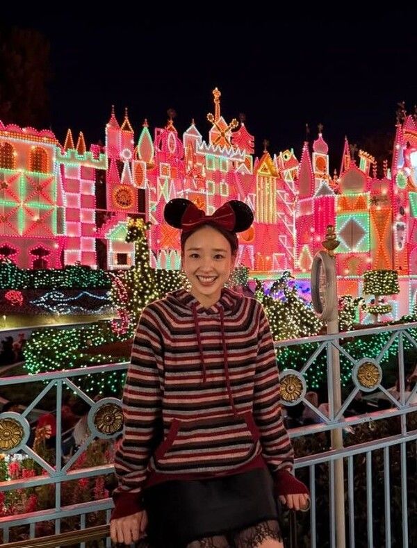 공개된 사진에서 손연재는 화려한 조명이 가득한 디즈니랜드를 배경으로 미키마우스 머리띠를 착용한 채 환한 미소를 짓고 있다. 스트라이프 니트와 편안한 캐주얼 차림으로 놀이공원 특유의 자유로운 분위기를 연출했다.