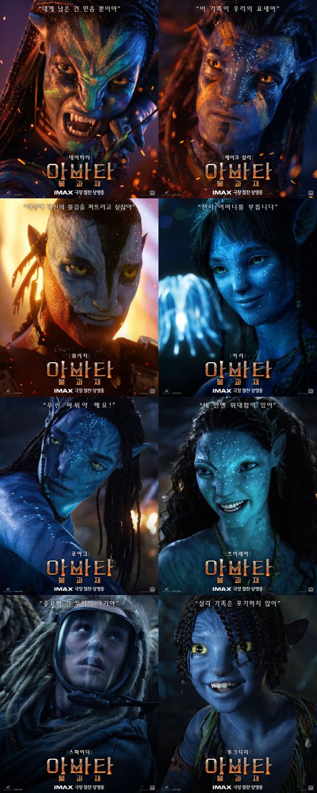 개봉을 기념해 공개된 9종의 캐릭터 포스터는 새롭게 등장하는 캐릭터부터 ‘아바타’ 시리즈를 이끈 주역들과 다음 세대를 끌고 나갈 ‘설리’ 가족의 아이들의 모습까지, 다양한 이들의 모습이 담겨 이목을 집중시킨다.