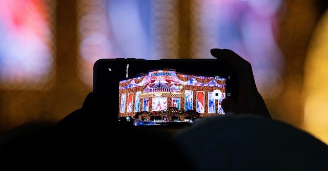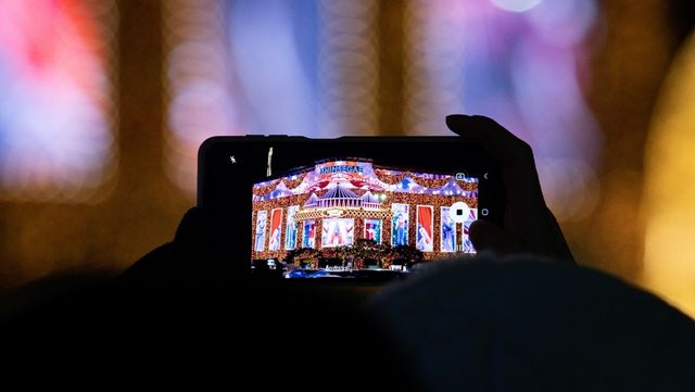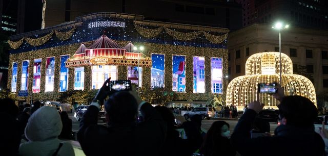 서울 명동거리를 찾은 시민들이 신세계백화점 본점 외벽 조명을 감상하며 연말 분위기를 만끽하고 있다 / 뉴스1