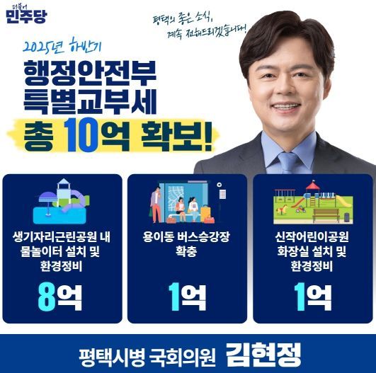 [와이뉴스] 김현정 국회의원(평택시병·더불어민주당)은 2025년 하반기 행정안전부 특별교부세 총 10억 원을 확보해, 지역 주민의 생활환경 개선과 안전·편의 증진을 위한 주요 현안 사업을 본격 추진한다고 밝혔다.