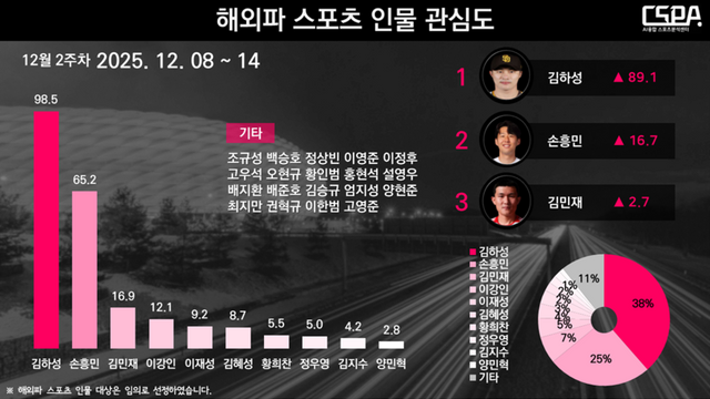 김하성과 손흥민은 각각 점유율 38%와 25%를 확보했다. 둘은 전체 63%의 점유율을 기록해 지난주 스포츠계 이슈 중심에 섰다.
