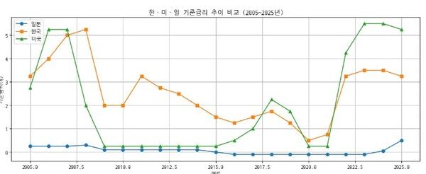 지난 20년간 한·미·일 기준금리 추이를 비교하면 세 나라의 통화 철학은 극명하게 갈린다. 미국은 위기 시 급격히 내리고, 회복 국면에서는 빠르게 올리는 전형적인 경기 대응형 정책을 유지해왔다. 한국은 미국의 방향을 참고하되, 성장률·가계부채·환율이라는 복합 변수를 함께 고려하는 중간 경로를 택해왔다.