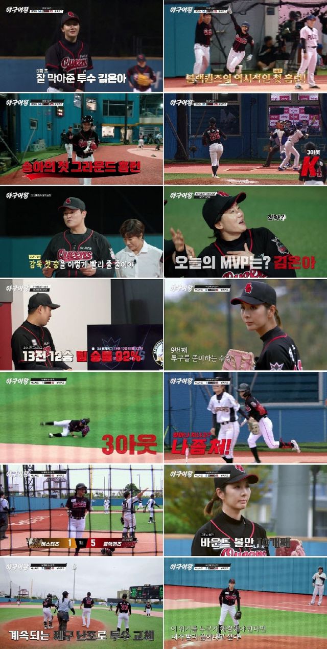 16일 방송한 채널A 스포츠 예능 ‘야구여왕’ 4회에서는 ‘레전드 선출’ 김민지·김보름·김성연·김온아·박보람·박하얀·송아·신소정·신수지·아야카·이수연·장수영·정유인·주수진·최현미가 뭉친 국내 50번째 여자 야구단 블랙퀸즈가 경찰청 여자 야구단과의 첫 경기를 기분 좋은 승리로 장식한 데 이어, ‘전국대회 퓨처리그 2회 우승팀’ 버스터즈와 두 번째 정식 경기를 치르는 현장이 박진감 넘치게 펼쳐졌다.
