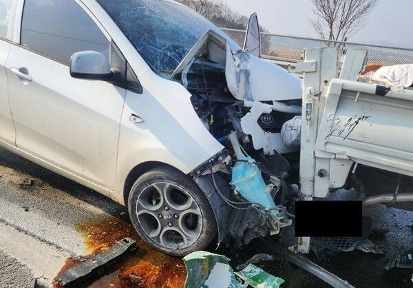충남 당진에서 경차가 도로 위 도색 작업자 등을 들이받아 60대와 20대 작업자가 중상을 입었다.
