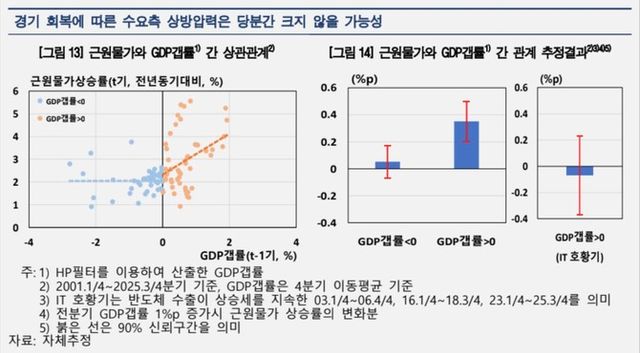 한은 관계자는 "최근과 같이 경기 회복이 반도체 수출 등 IT 부문에 집중된 경우, 경기의 물가영향이 더욱 제한될 수 있다"며 "경기 회복의 초기로 성장세가 완만한 현재와 같은 경제상황에서는 경기측 물가 영향이 제한적일 수 있다"고 설명했다.