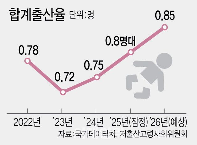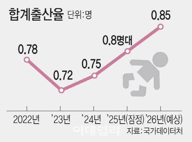 17일 이데일리 단독 취재에 따르면 올해 합계출산율이 0.8명대를 기록할 것으로 예상되는 가운데 2026년 합계출산율도 0.85명대로 예측됐다. 지난해(0.75명)부터 시작된 상승세가 3년 연속 이어지는 셈이다.