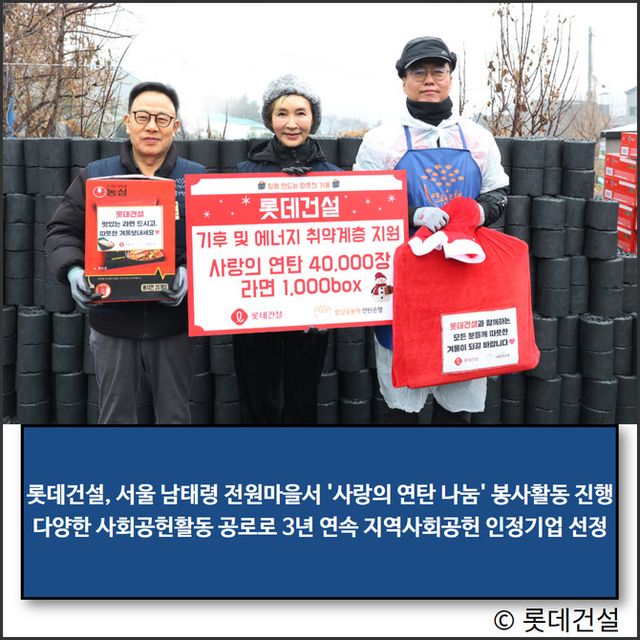 '사랑의 연탄 나눔'은 2011년부터 시작해 올해로 15년째를 맞는 롯데건설의 대표적인 사회공헌활동 중 하나로, 독거노인, 저소득층 등 어려운 형편의 가정이 밀집한 지역을 찾아가 연탄 등 난방용품을 기부함으로써 이웃에게 실질적인 도움을 주고 있다. 현재까지 기부한 연탄 수량은 올해를 포함해 서울 지역 44만장, 부산 지역 등 42만1500장 총 86만1500장에 달한다.