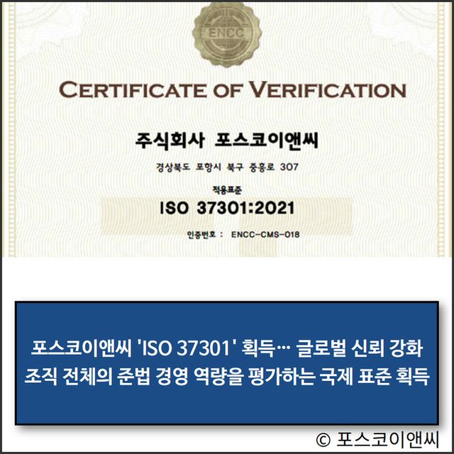 포스코이앤씨가 윤리준법경영인증원으로부터 국제 공인 규범준수경영시스템(ISO 37301) 인증을 획득했다고 17일 밝혔다.