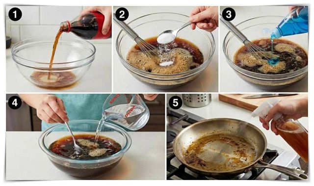 콜라와 소금만 단독으로 쓰는 방법도 있다. 팬 바닥에 콜라를 붓고 소금을 뿌린 뒤 잠시 두었다가 문지르는 방식이다. 다만 이 경우 실제 세정의 핵심은 물리적 문지르기이기 때문에, 기름막이 두꺼운 경우에는 주방세제를 함께 쓰는 쪽이 효율이 높다. 베이킹소다를 추가해 거품을 내는 변형도 있지만, 이는 가벼운 오염에 적합한 수준으로 평가된다.
