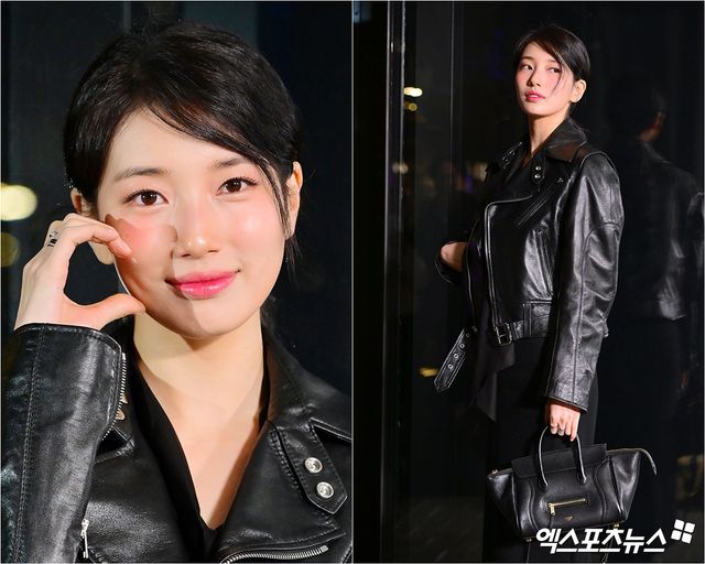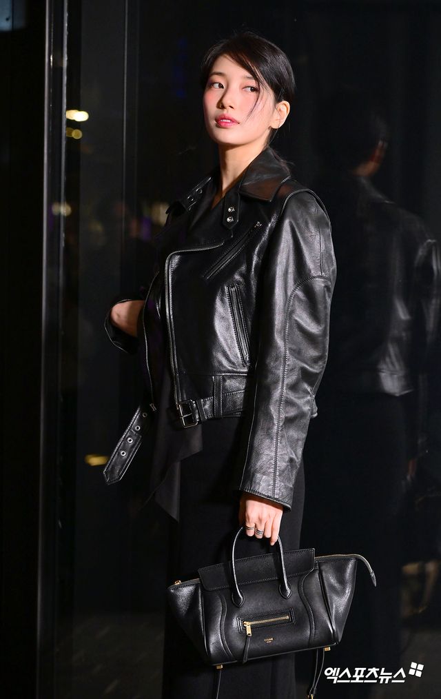 이날 행사에 참여한 수지는 블랙 가죽 자켓에 클래식한 더블 버튼 디자인에 은은한 광택이 더해져, 강인함과 세련미를 동시에 담아냈다. 각 잡힌 숄더 라인과 허리선을 따라 떨어지는 실루엣은 수지의 슬림한 체형을 더욱 돋보이게 했다. 레더 특유의 하드함은 이너로 매치한 블랙 원피스의 부드러운 소재감과 대비되며 스타일의 균형을 잡았다.