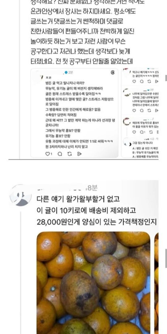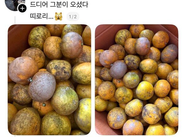 또 다른 구매자는 “귤 하나 때문에 밤새 뒤척였다”며 “예쁜 귤은 방부제를 써서 위험하다는 말에 속아 이걸 더 좋은 귤이라 믿고 샀다. 그런데 돌아온 건 곰팡이 가득한 쓰레기였다”고 비통한 심정을 전했다.
