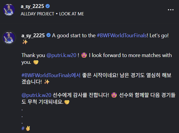 안세영은 17일 늦은 밤 자신의 SNS를 통해 "월드투어 파이널에서 좋은 시작이네요! 남은 경기도 열심히 해보겠습니다"라면서 "와르다니 선수에게 감사를 전합니다. 선수와 함께할 다음 경기들도 무척 기대되네요"라면서 브이(V) 이모티콘을 붙였다.