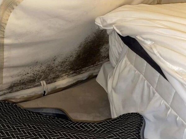 사진 속 침대 머리맡 벽면에는 곰팡이가 득실거렸다. A씨는 침대와 텐트 벽이 맞닿아 있어 호흡 과정에서 곰팡이를 흡입할 가능성이 있다고 설명했다.