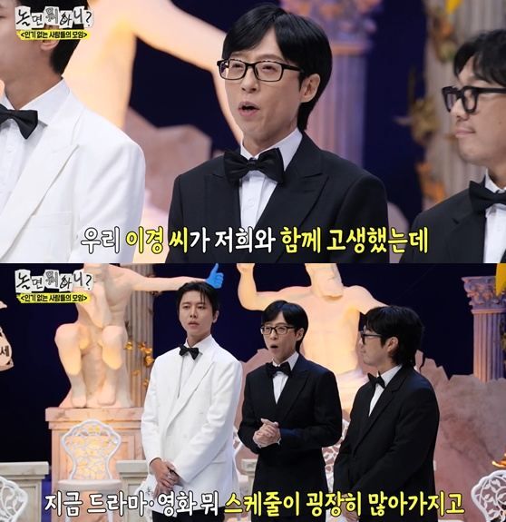 특히 유재석은 최근 사생활 루머로 몸살을 앓은 이이경을 MBC '놀면 뭐하니?'에서 떠나보내기도 했다. 당시 그는 이이경 하차 후 첫 녹화에서 "지금까지 3년여 동안 우리 이경 씨가 저희와 함께 고생했는데 드라마, 영화 스케줄이 굉장히 많아서 우리 제작진하고 함께 조율을 하다가 하차하게 됐다"고 말했다.