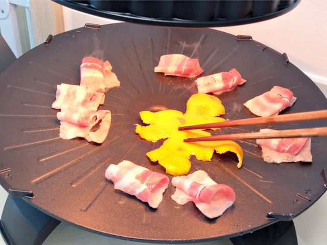 불판 한쪽에 귤껍질을 함께 올려보세요.