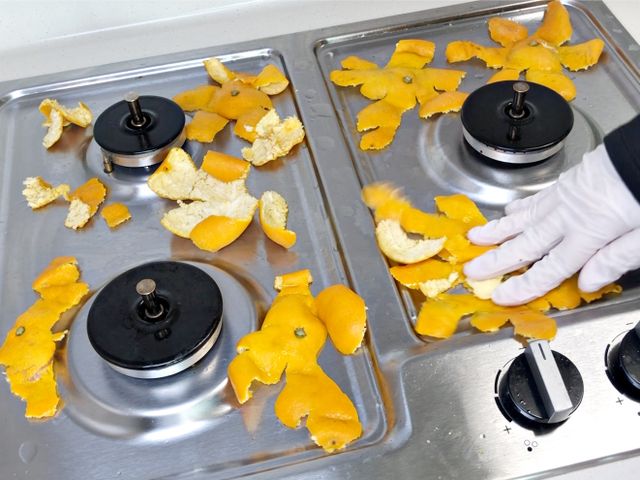 또, 데워진 귤껍질로 가스레인지 주변이나 화구를 닦아도