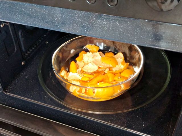 그릇에 물과 귤껍질을 담아 전자레인지에서 5분 정도 돌려보세요.